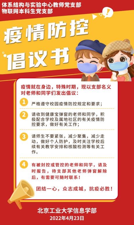 4月22日,突如其来的疫情打乱了老师同学们正常的工作学习节奏,健康宝弹窗、流调通知、正常教学如何运行等各种问题都需要及时解决。信息学部体系结构与实验中心教师党支部第一时间行动起来,充分发挥党支部战斗堡垒作用,于23日即联合物联网本科生党支部向所在支部所有老师和同学们发出倡议,倡导本支部师生严格遵守学校疫情防控规定,积极配合学校及属地社区工作,做好个人防护,消除紧张情绪,团结一致,共同抗疫。