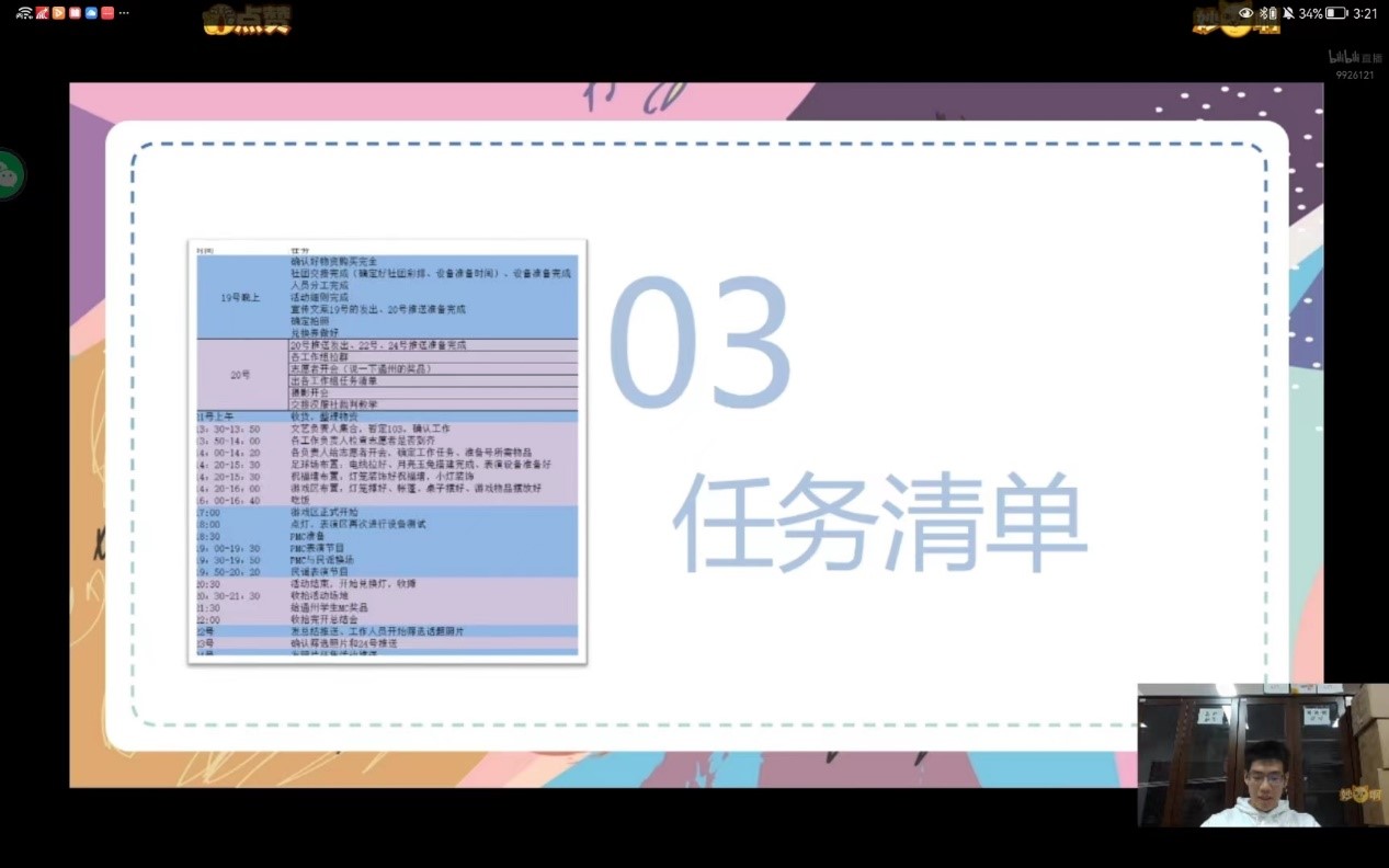 本次初级团校中,孙跃扬同学为大家进行了活动策划撰写组织培训。首先,他为同学们讲解了策划活动的五项基本工作。从策划、组织、对接、场务和宣传由表及里地分别为同学们介绍内容,推进大家对活动策划的深入理解,便于后续工作的开展。