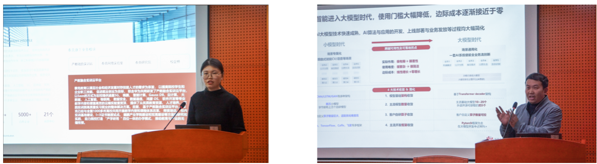 接着,王老师做了大模型与创新赛结合探索的报告。以现在已经落地的大模型为例,讲解我们应该如何建立项目、利用大模型,包括赋能金融行业大模型、赋能检察院智能12345场景、赋能法院职业放贷人场景等,给了同学们很多场景化的开发思路。同时,老师推荐了Mindspore技术公开课,鼓励大家进行学习。